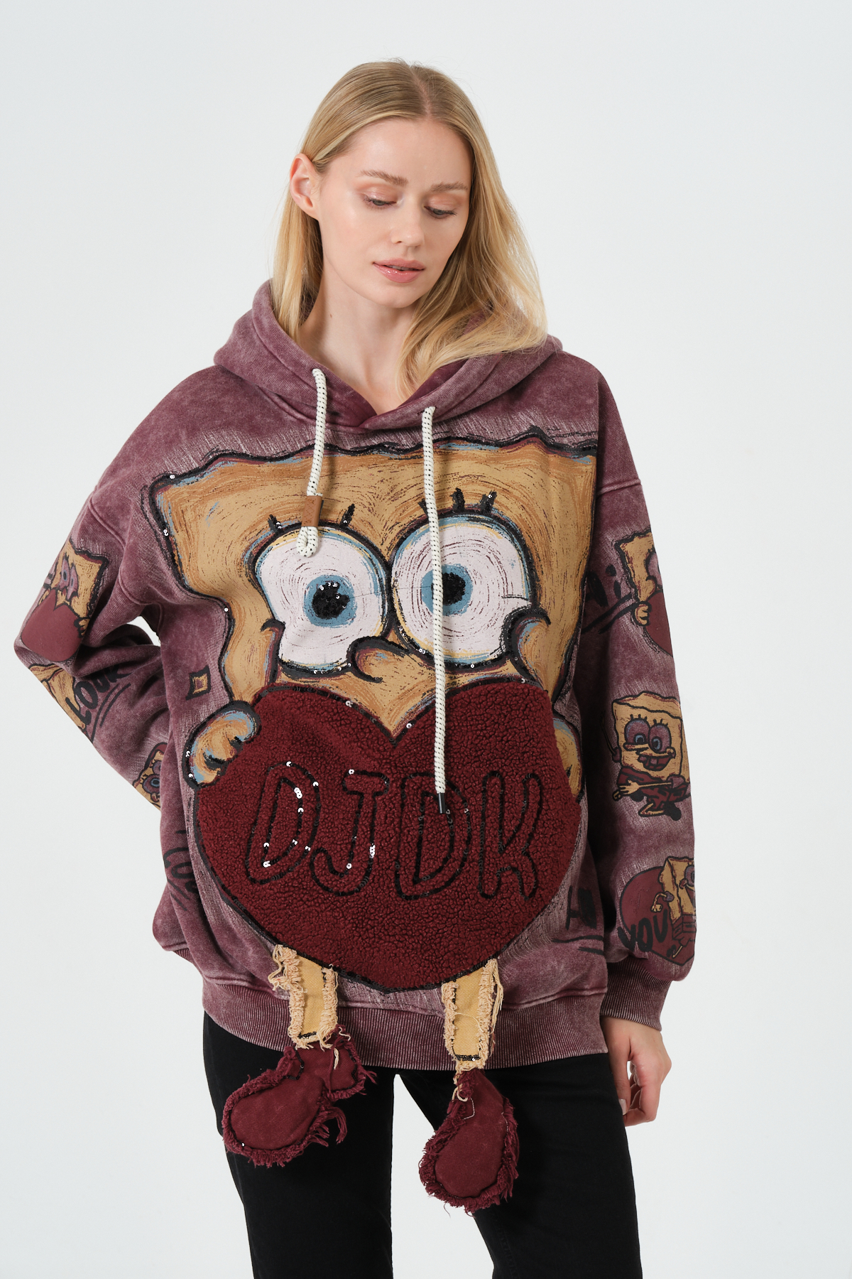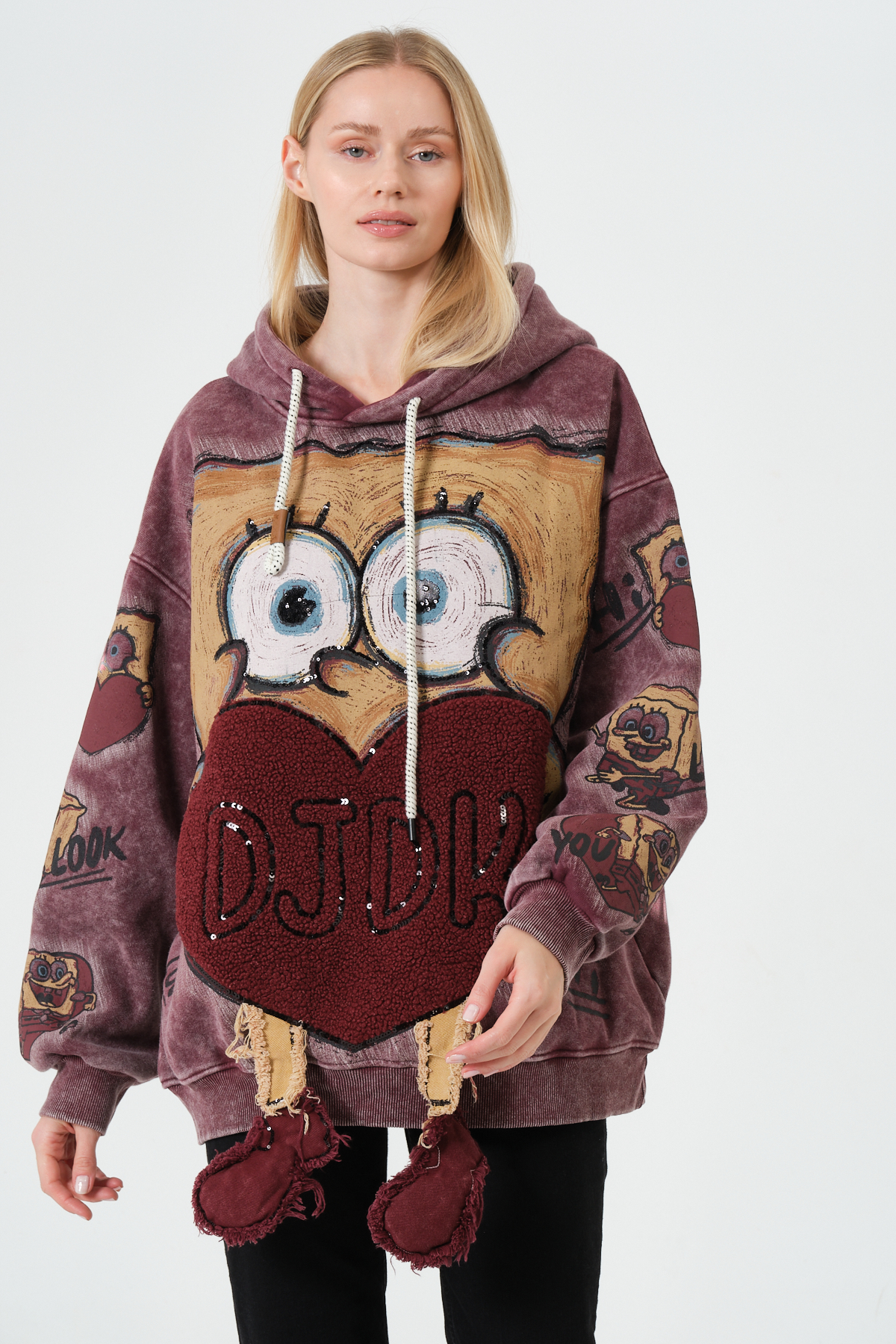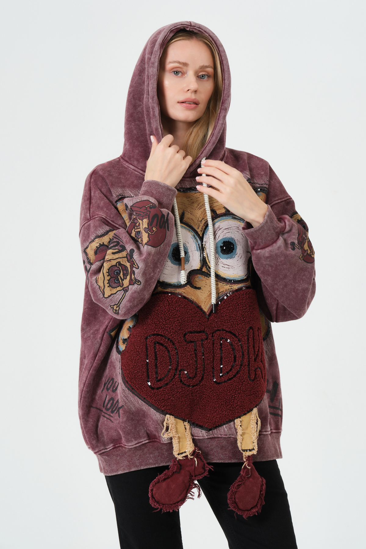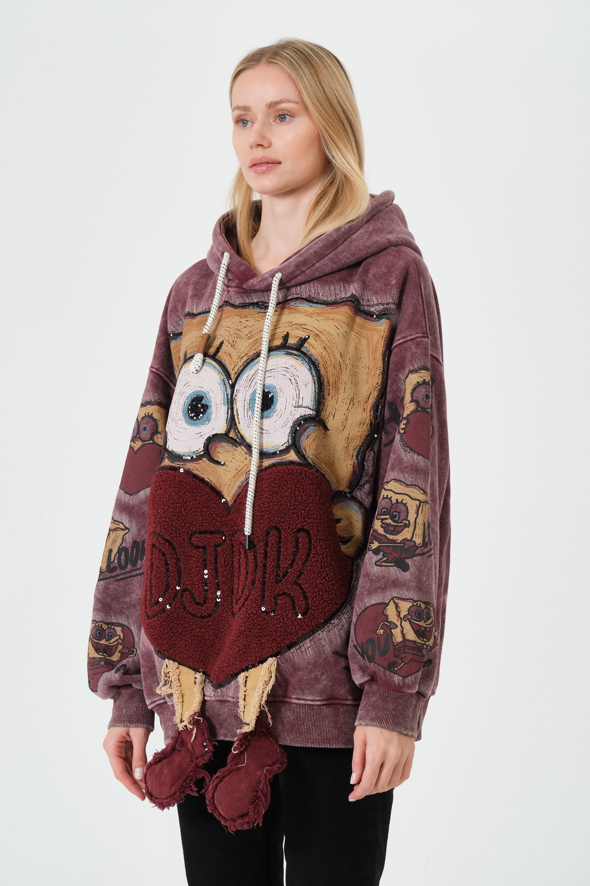 Peluş detaylı, karakter baskılı kadın oversize hoodie. Yumuşak kumaşı ve modern tasarımıyla günlük kullanım için ideal kapüşonlu sweatshirt.