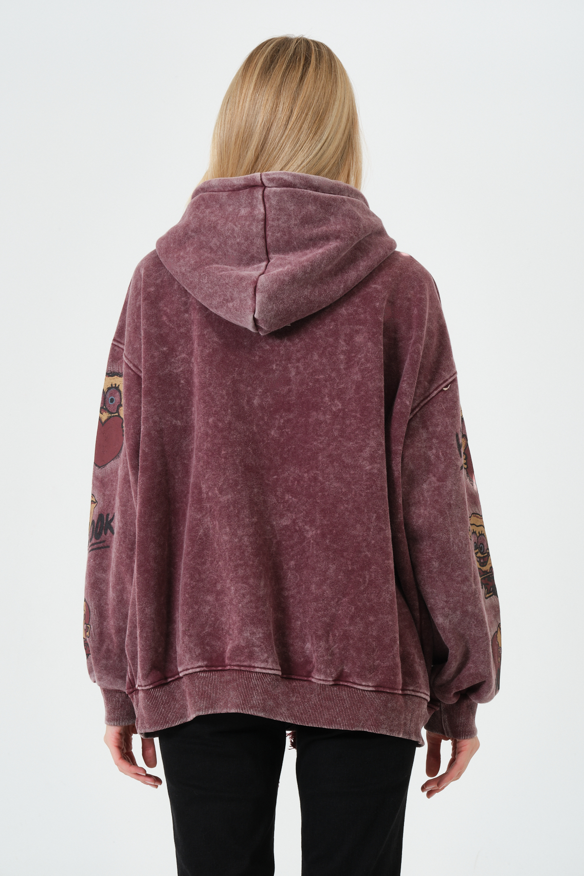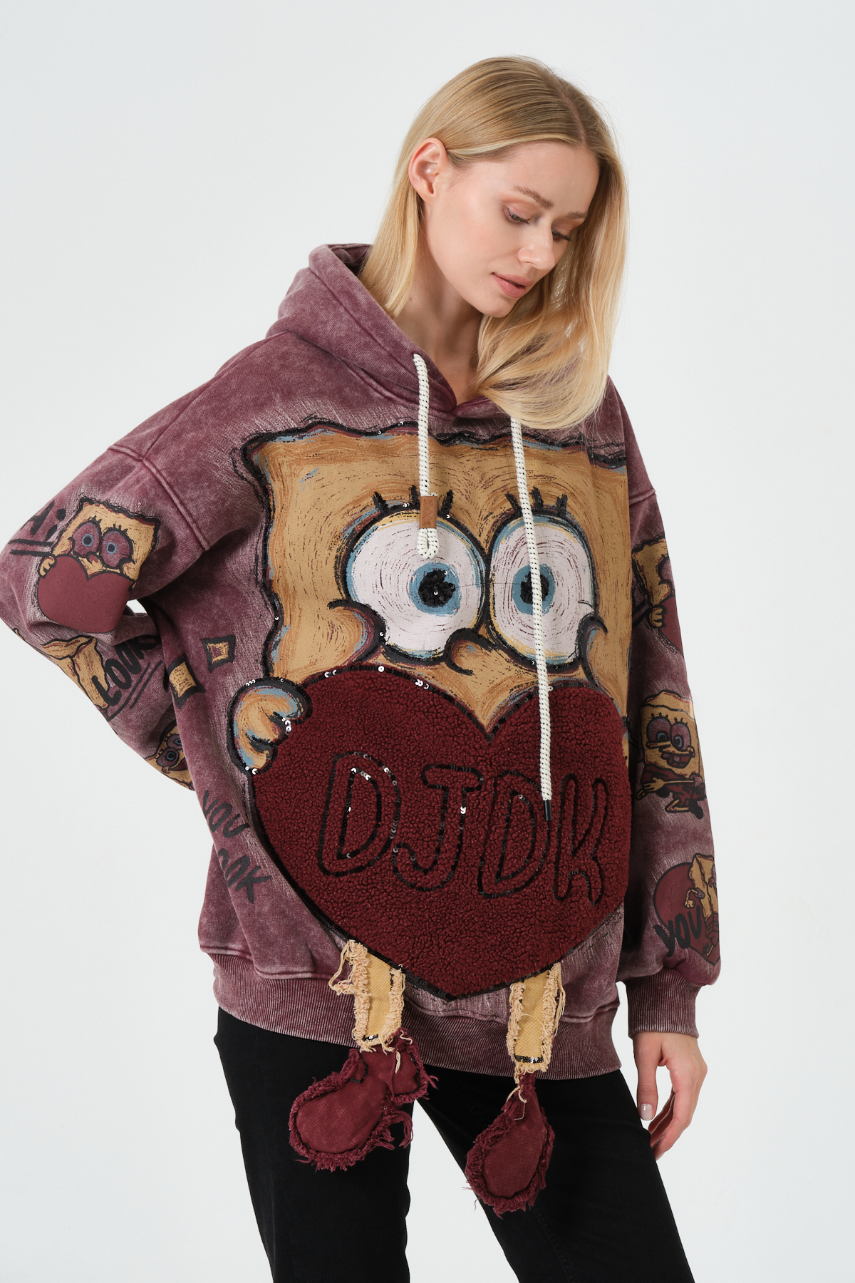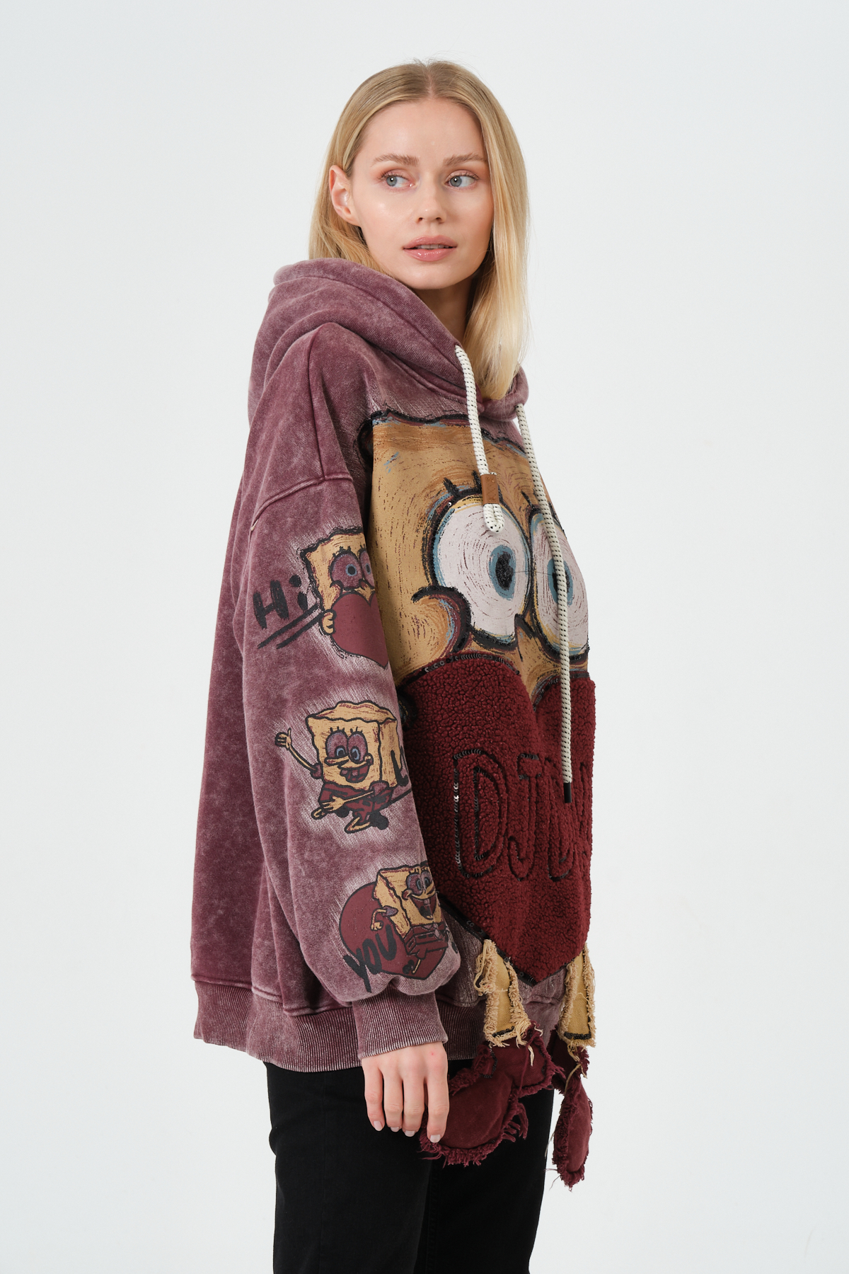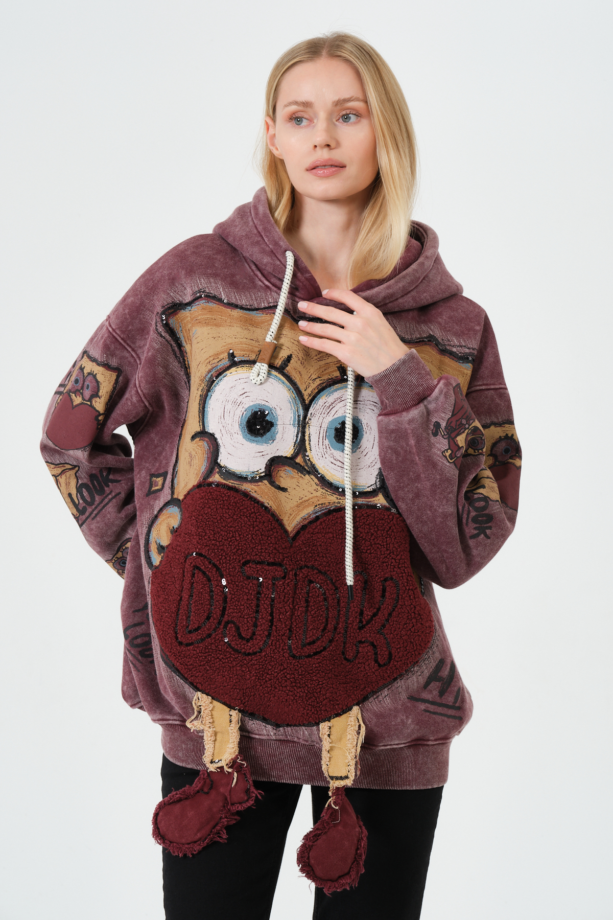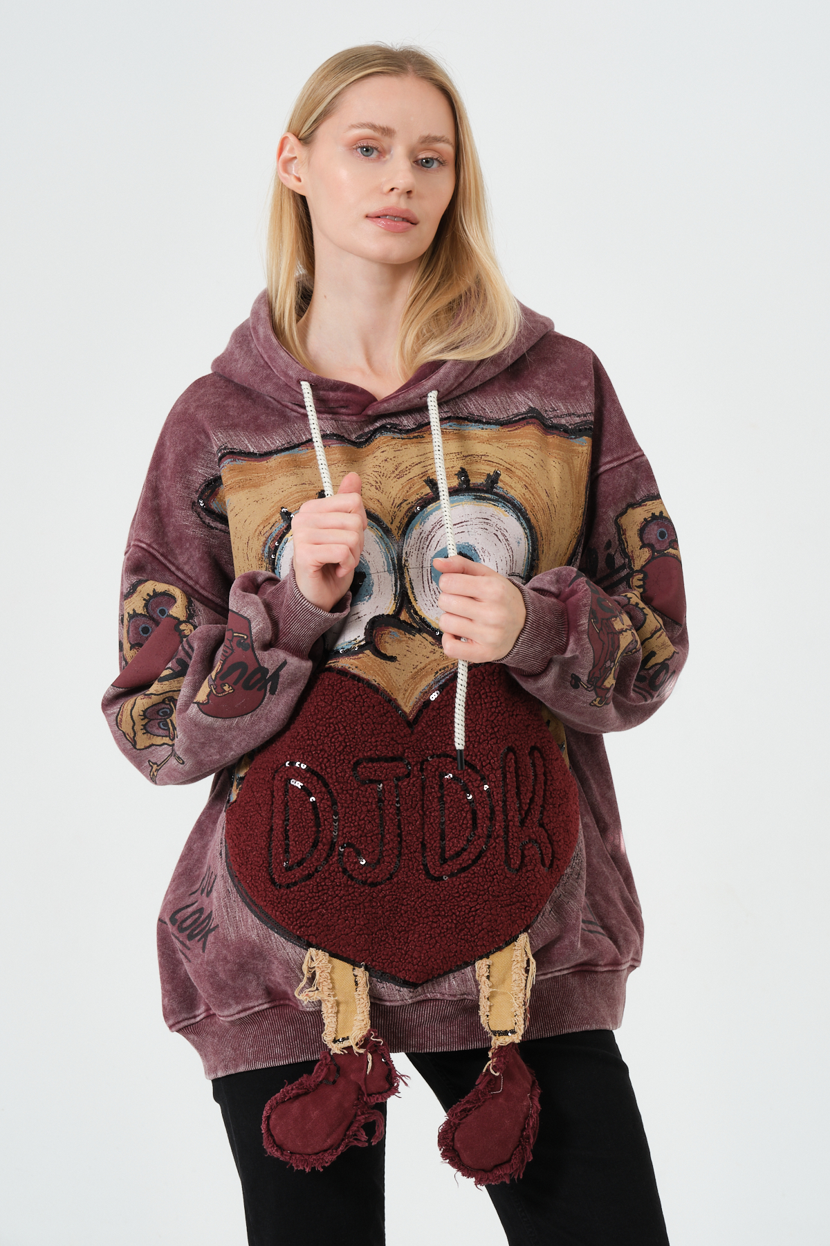 Peluş detaylı, karakter baskılı kadın oversize hoodie. Yumuşak kumaşı ve modern tasarımıyla günlük kullanım için ideal kapüşonlu sweatshirt.