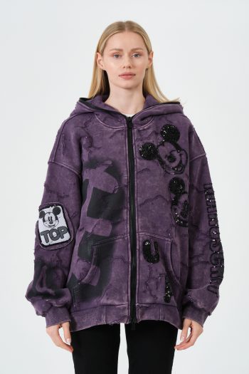 Mor oversize patchwork hoodie; vintage detaylı, rahat kesimli, modern kadın kapüşonlu sweatshirt. Sokak stiline uygun şık ve dikkat çekici tasarım.