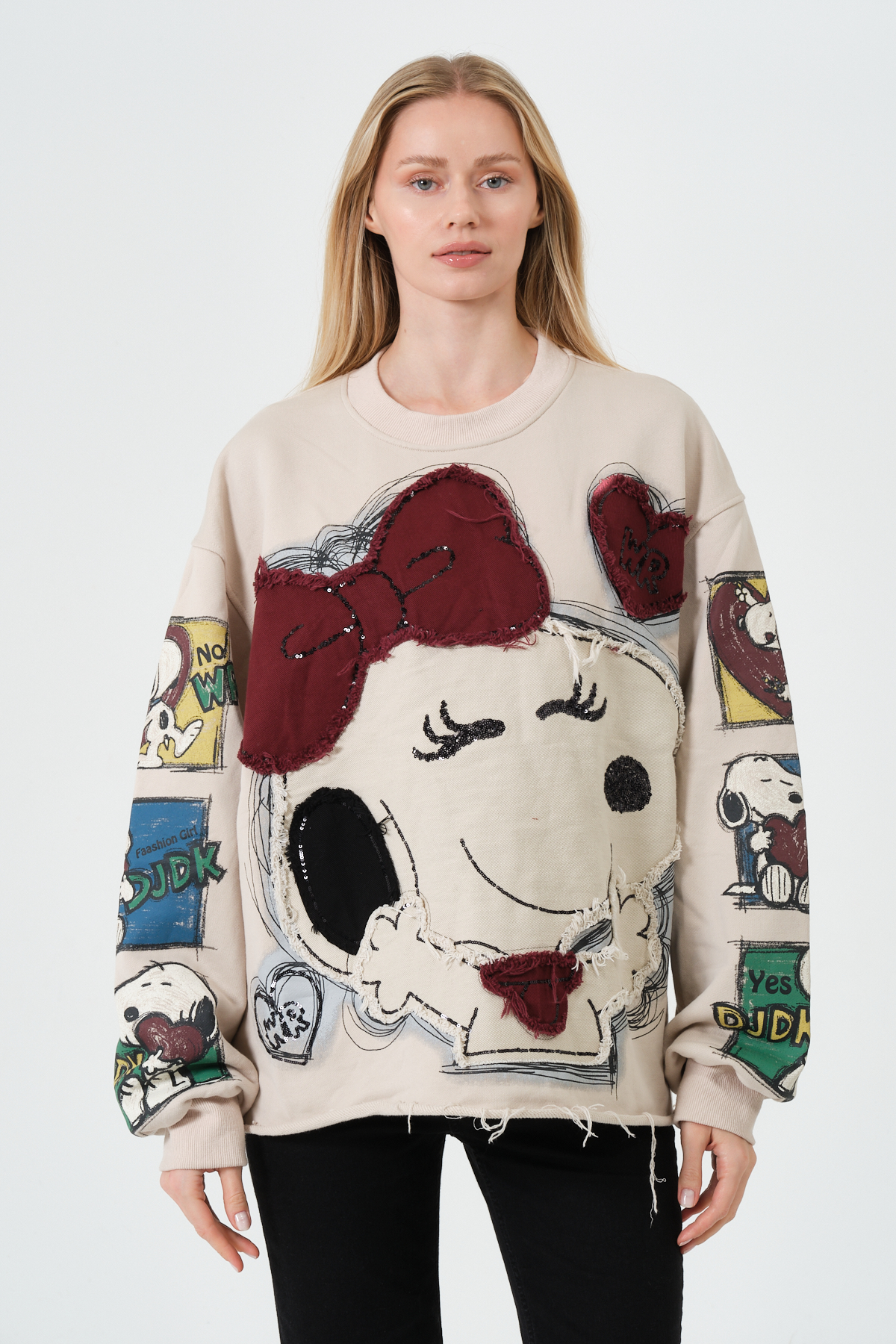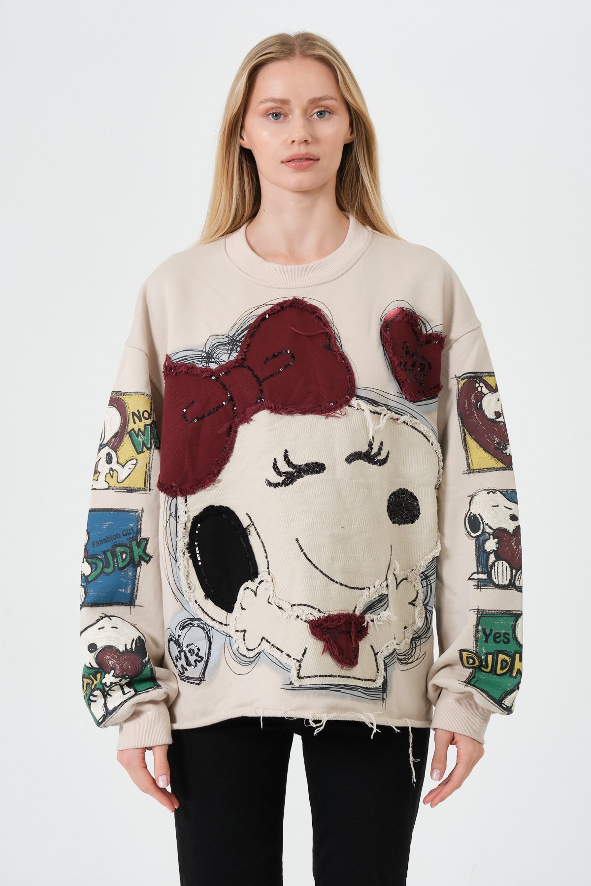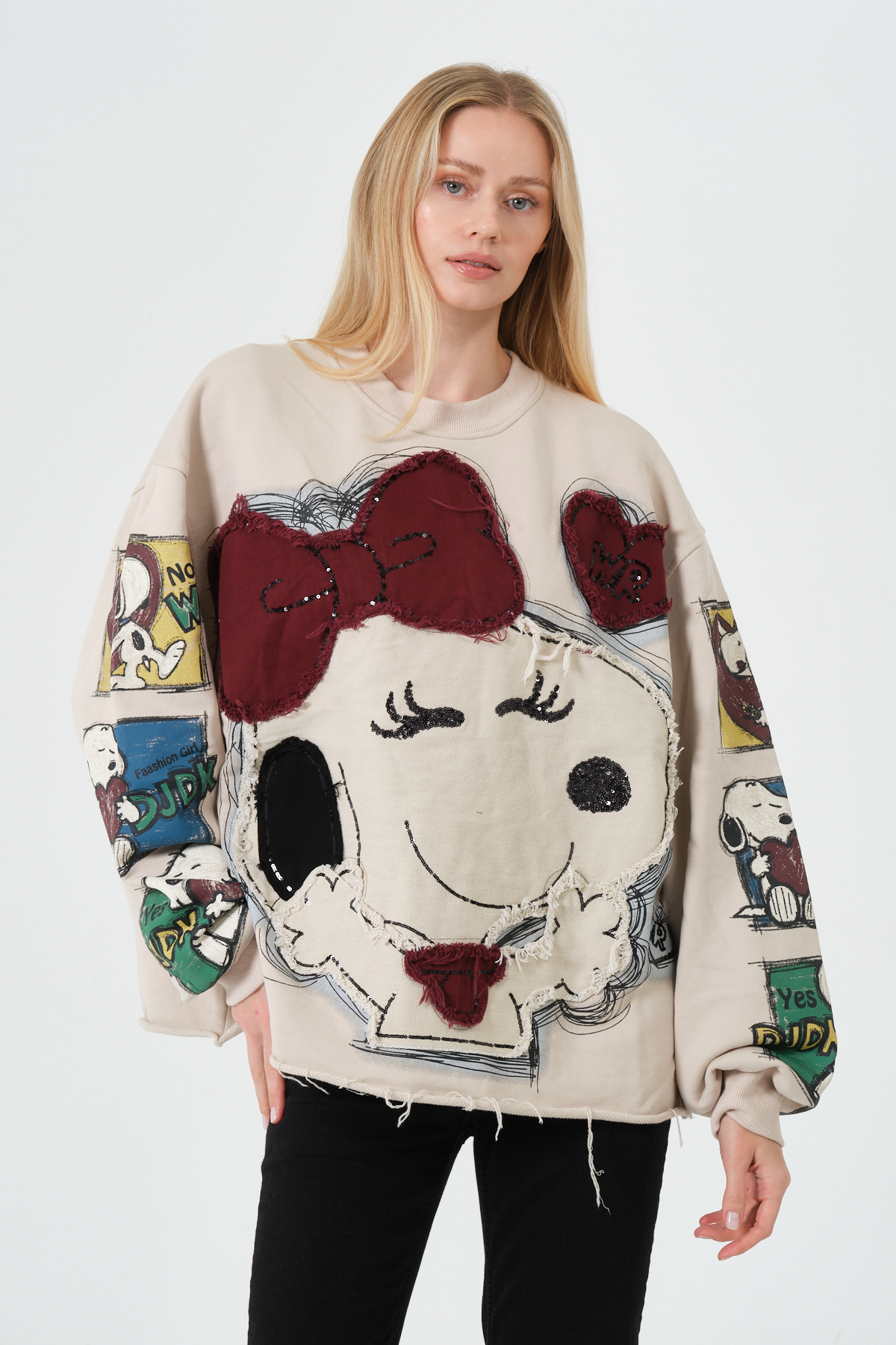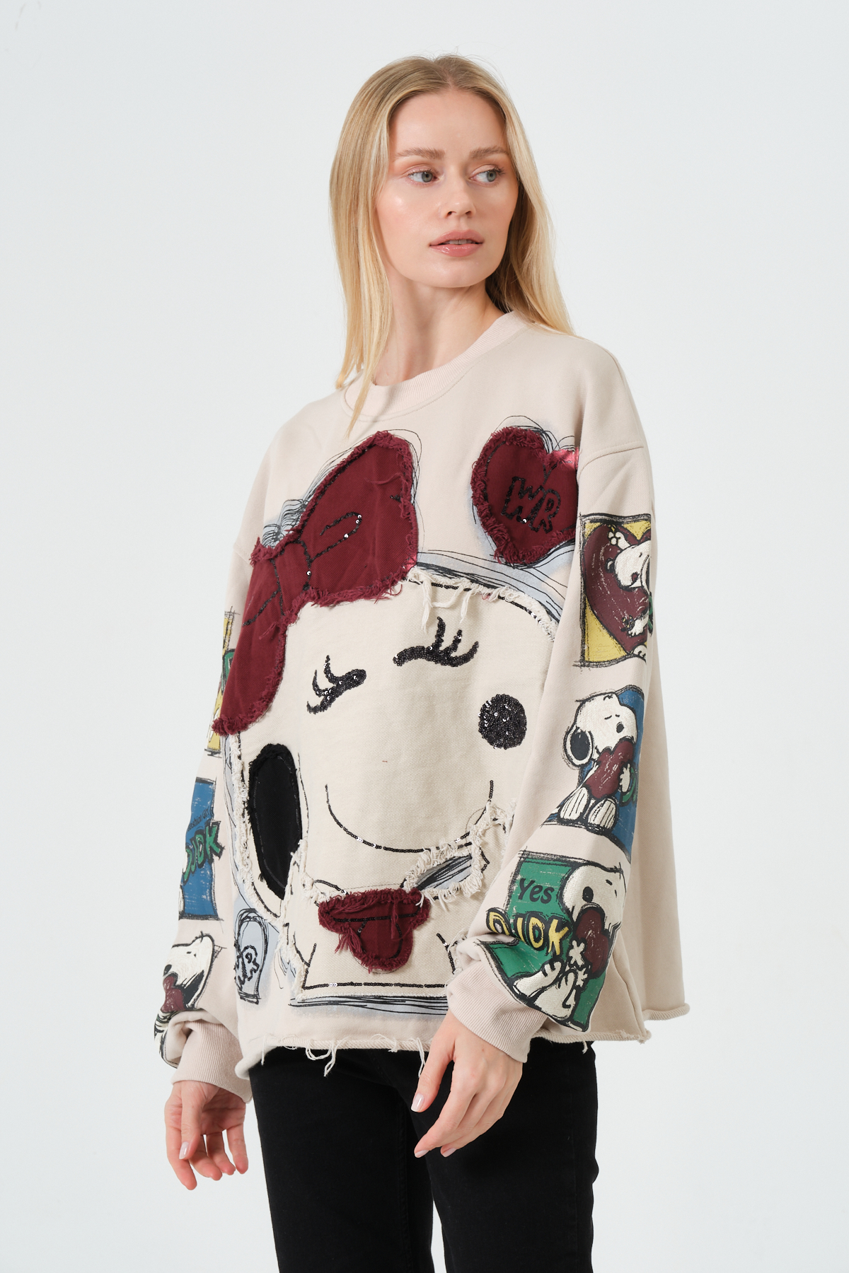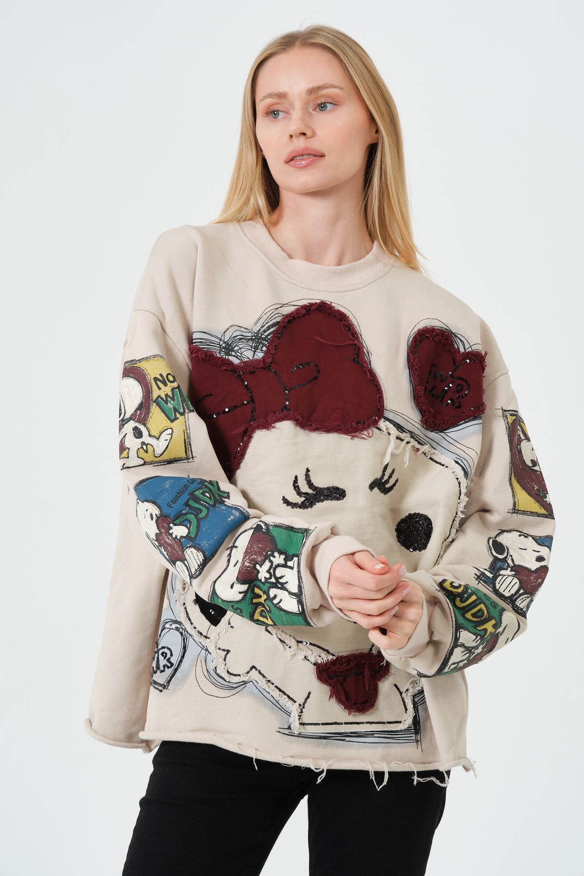 Peluş detaylı, karakter baskılı kadın oversize hoodie. Yumuşak kumaşı ve modern tasarımıyla günlük kullanım için ideal kapüşonlu sweatshirt.