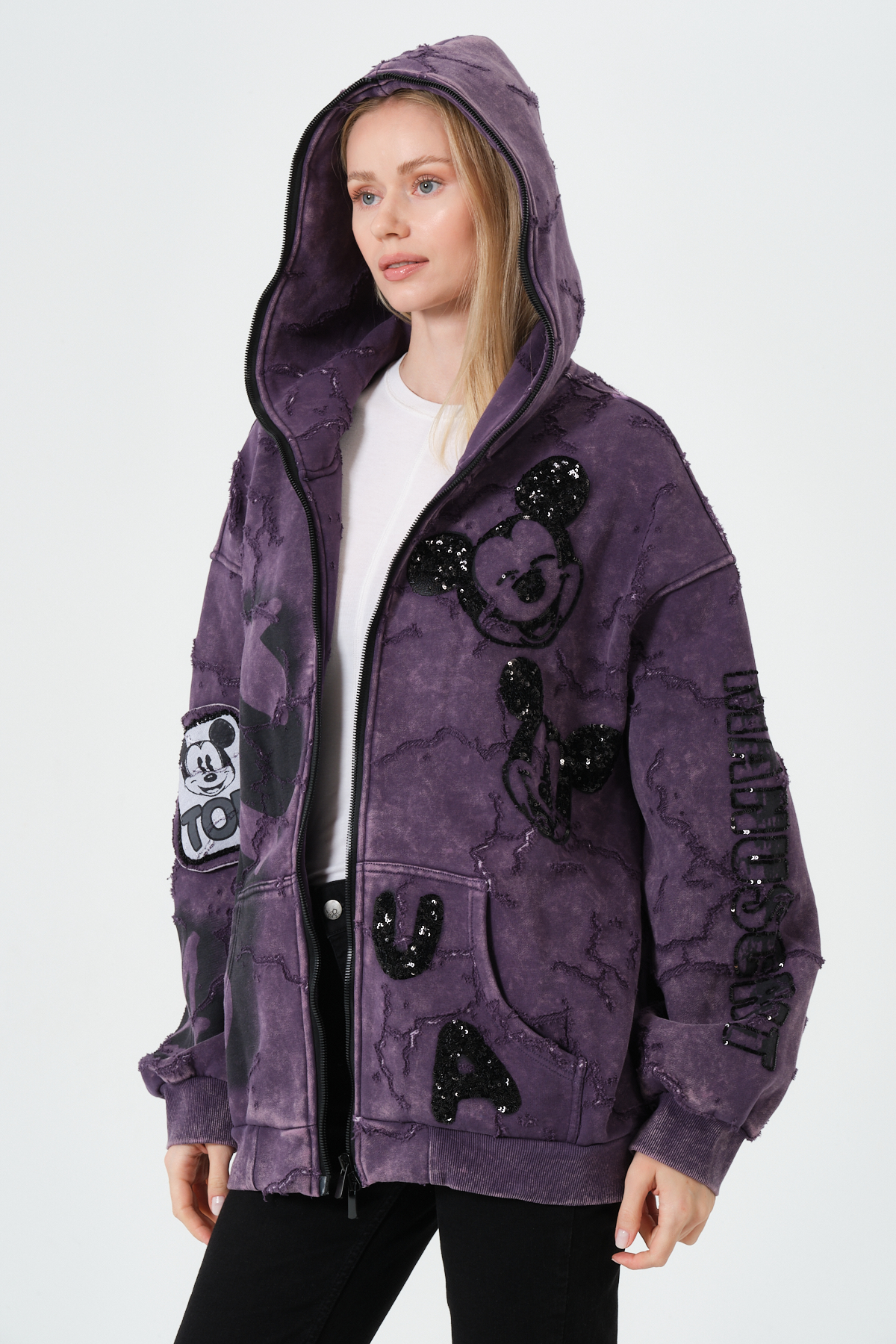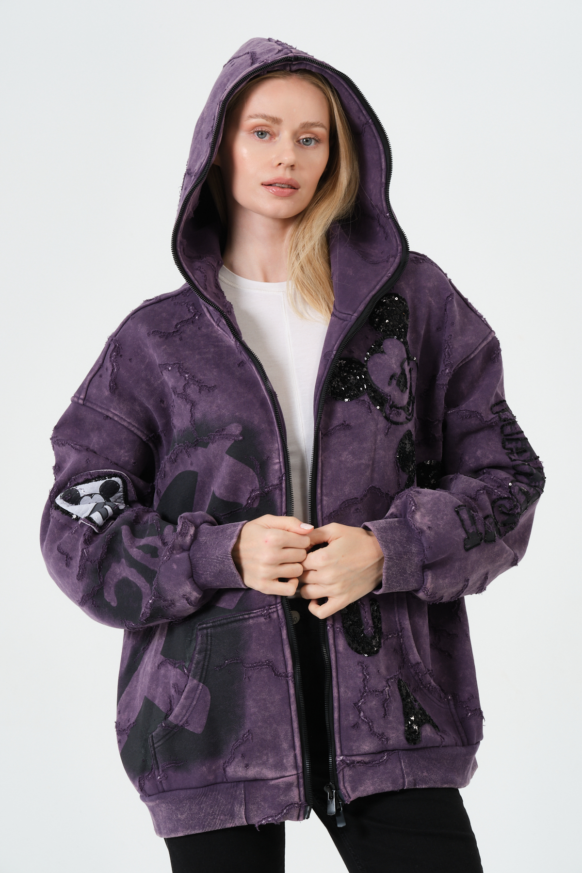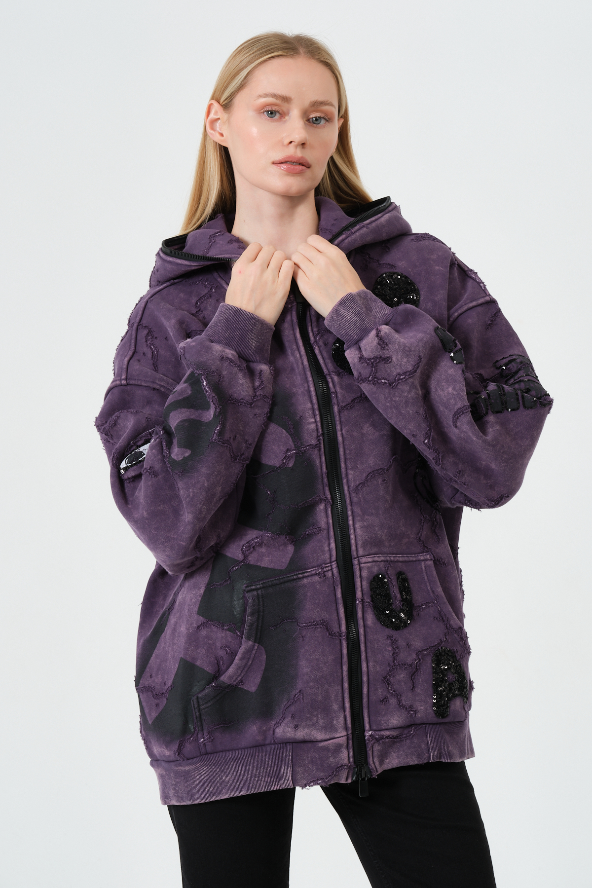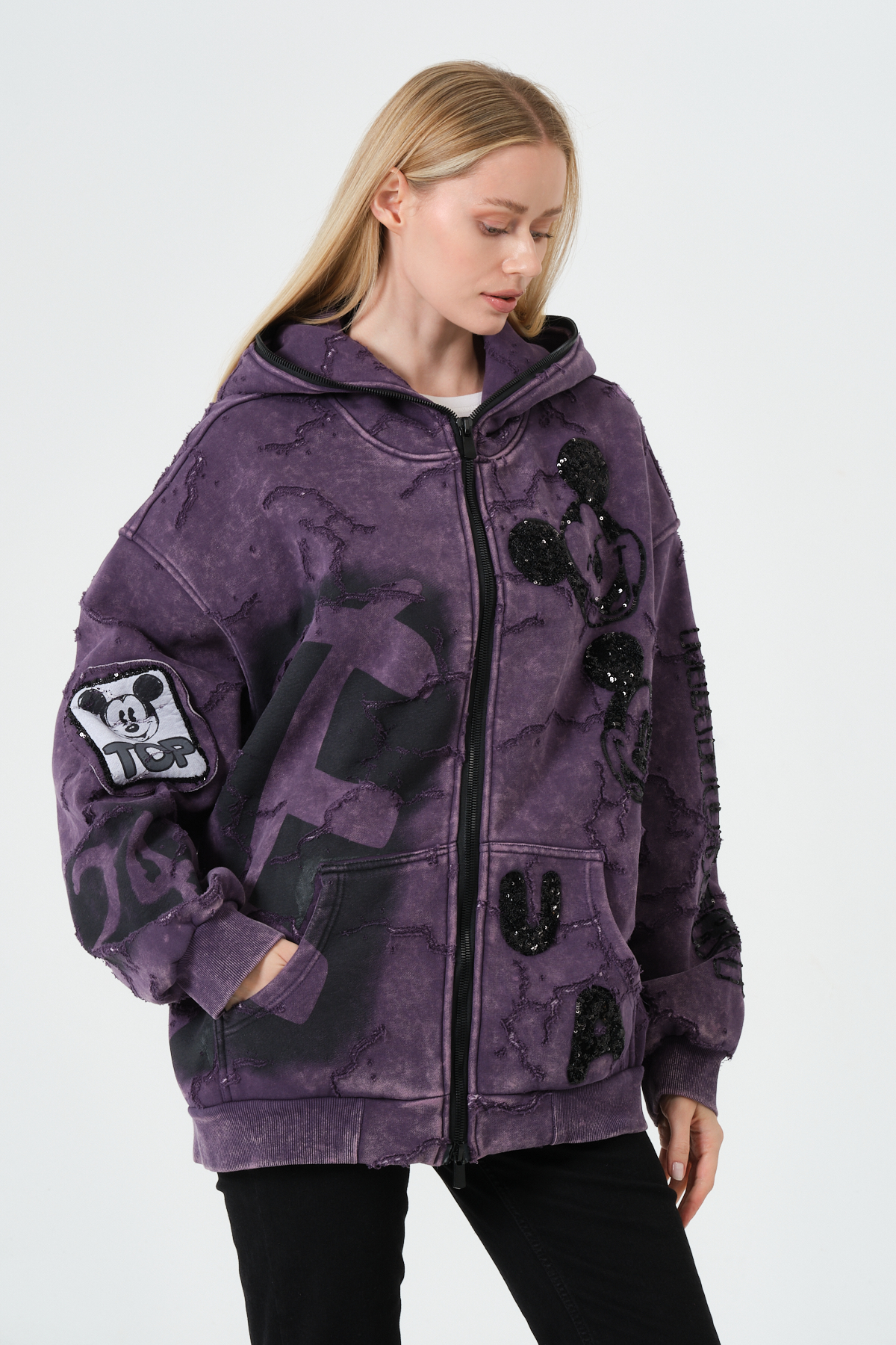 Mor Kadın Oversize Hoodie – Patchwork ve Baskı Detaylı Kapüşonlu Sweatshirt