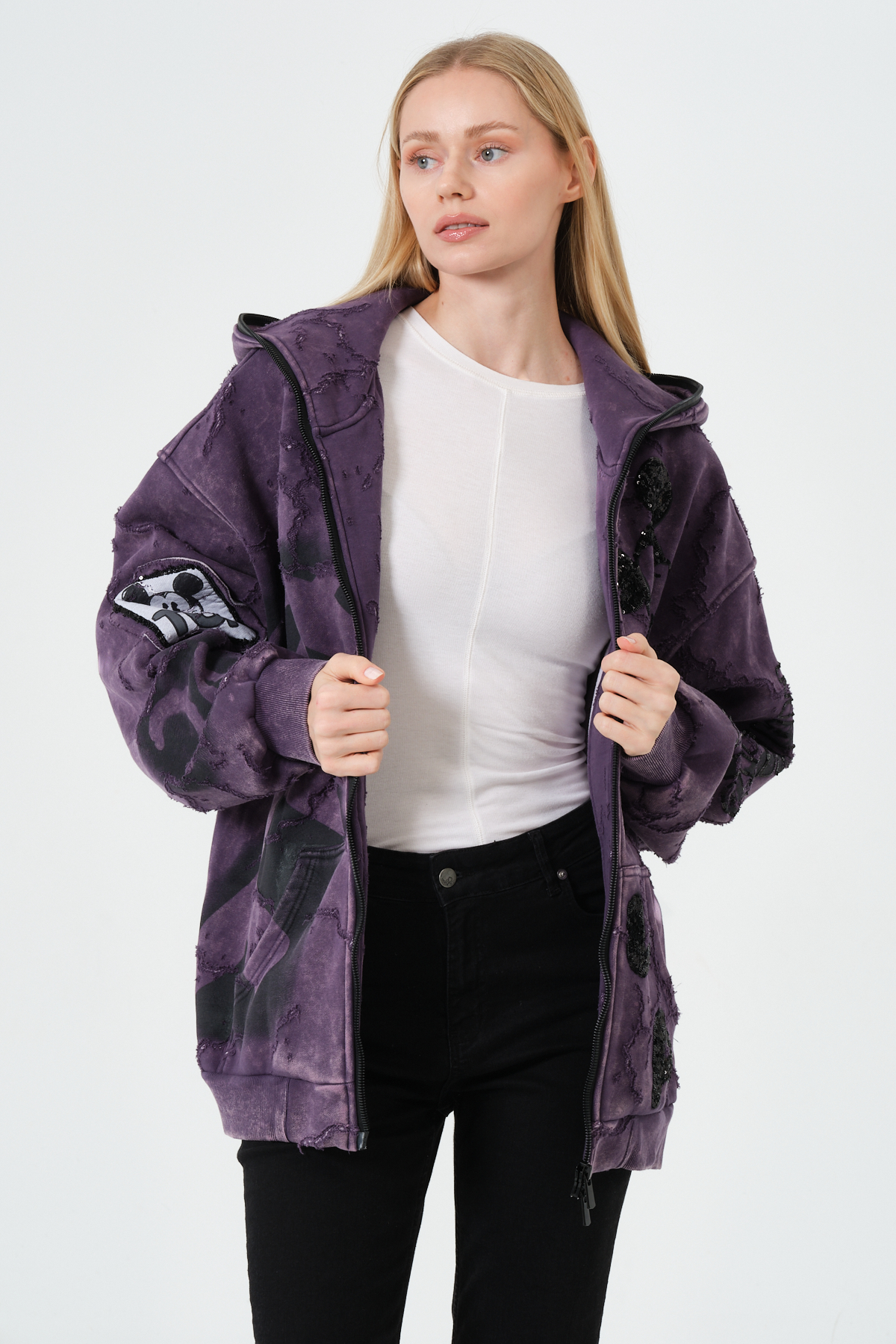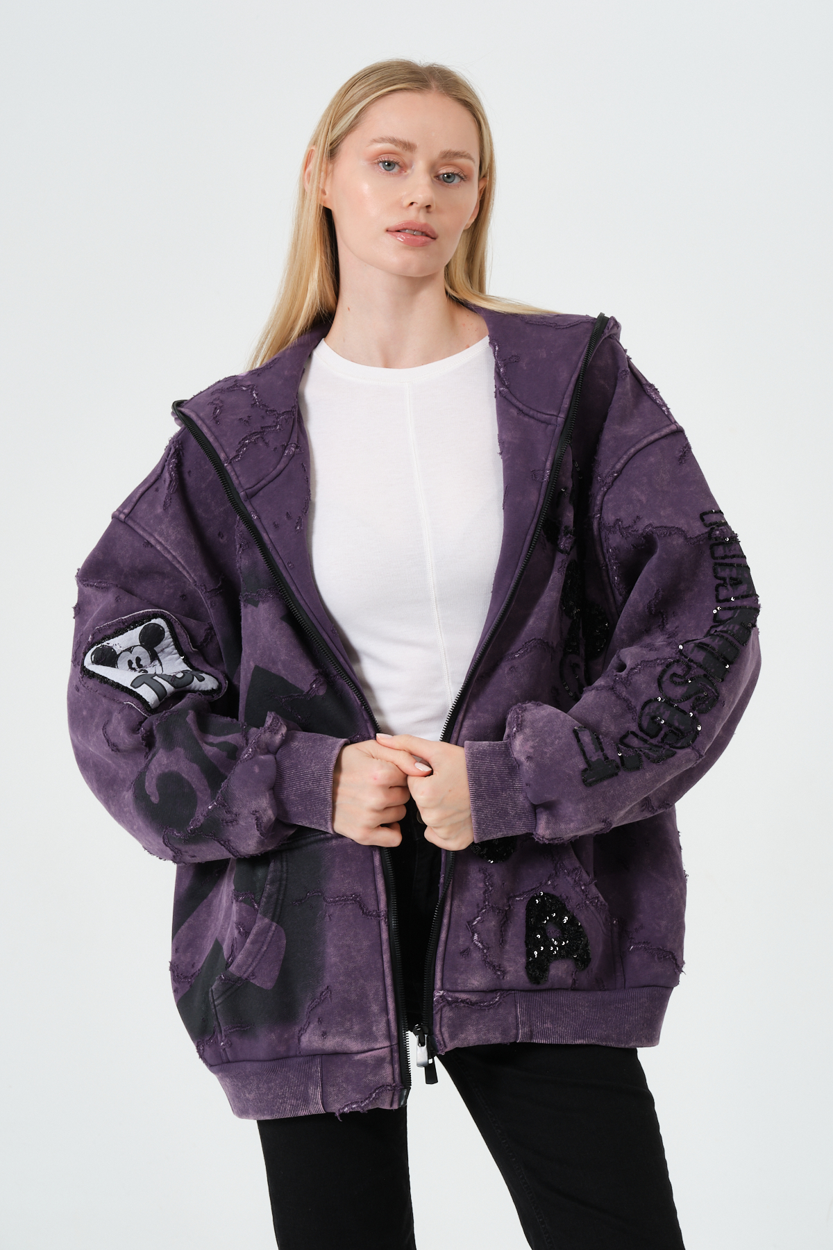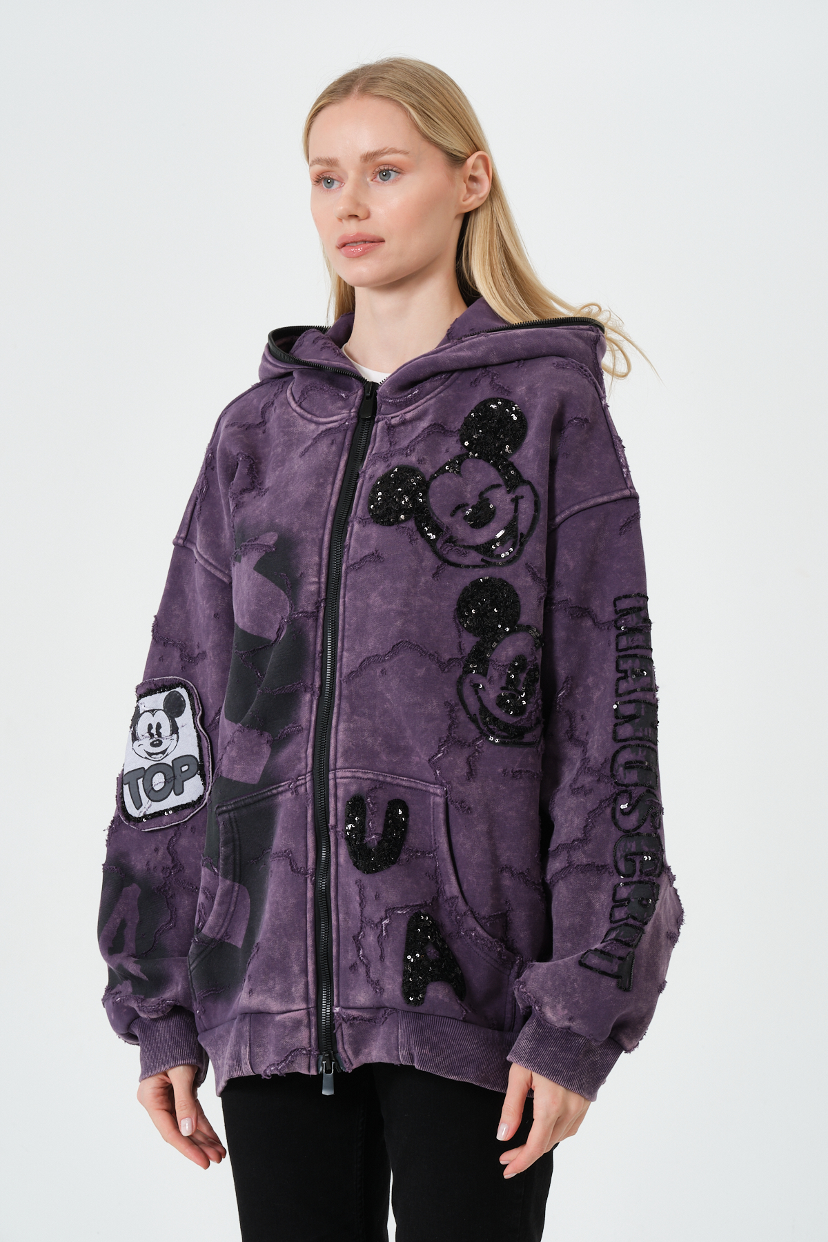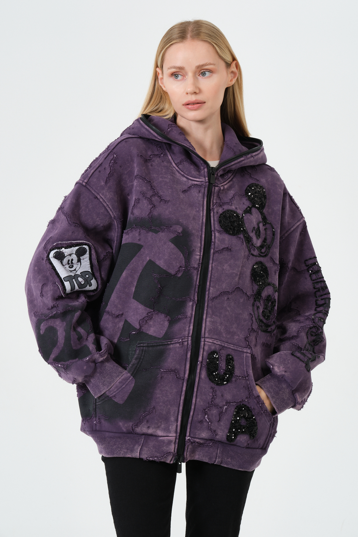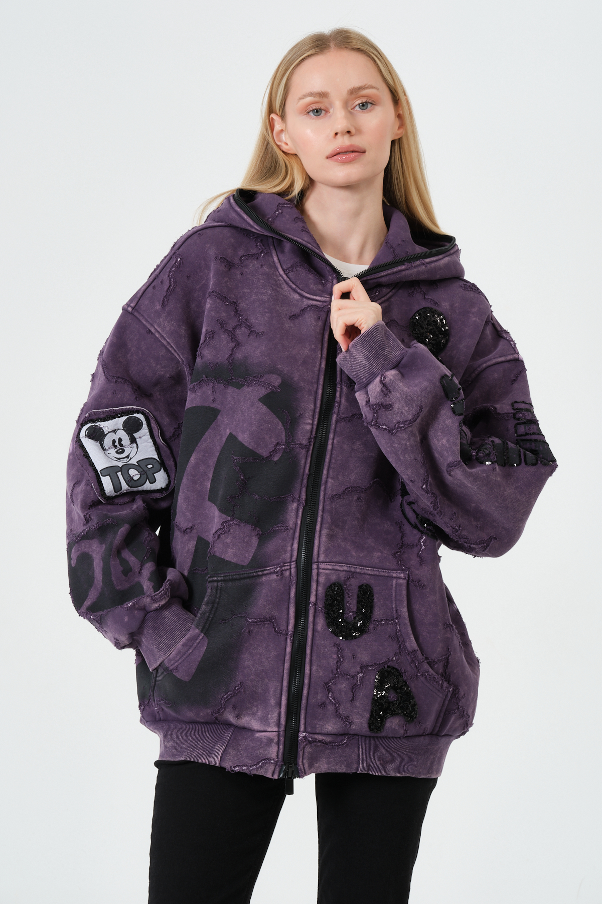 Mor Kadın Oversize Hoodie – Patchwork ve Baskı Detaylı Kapüşonlu Sweatshirt