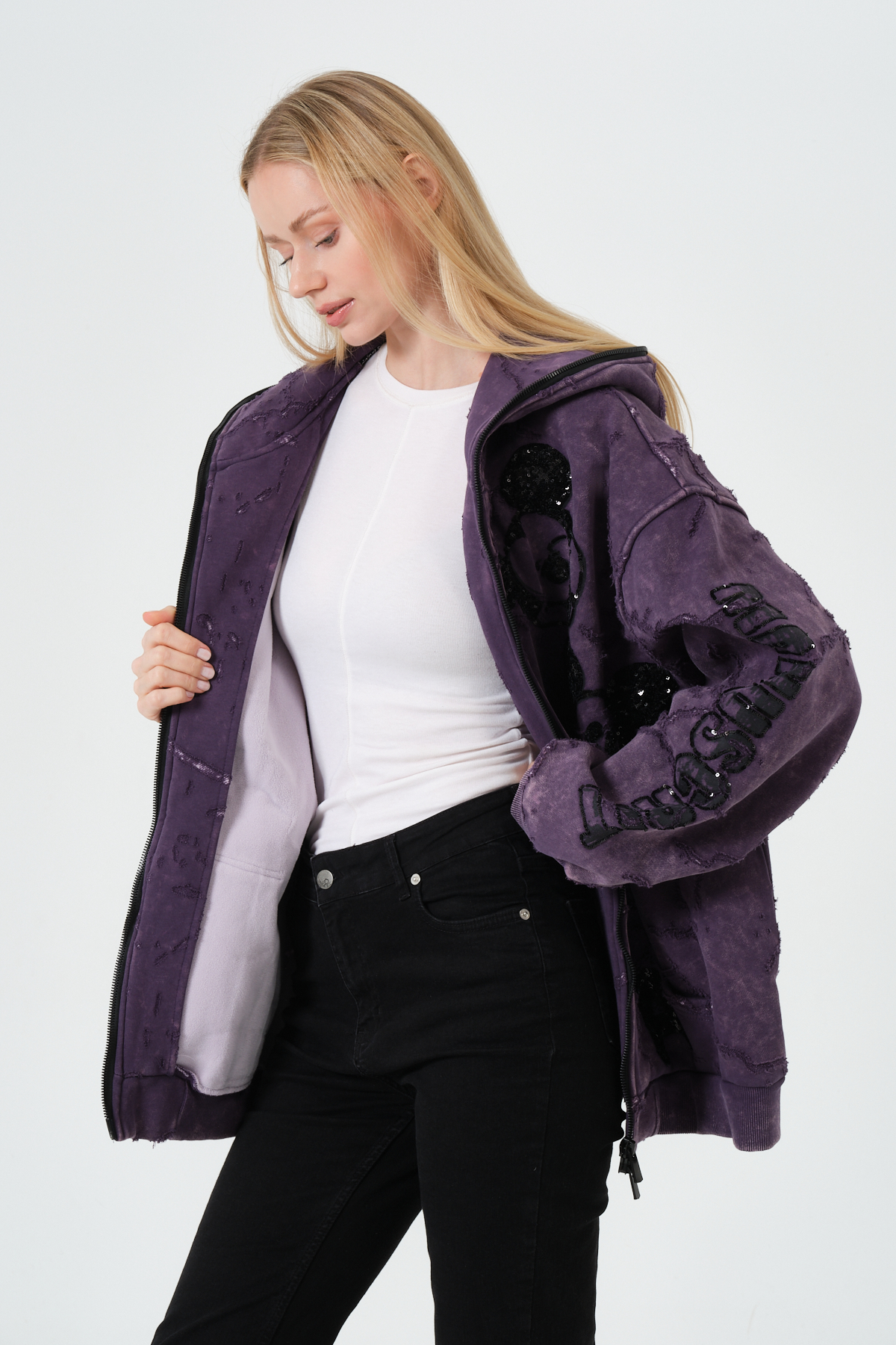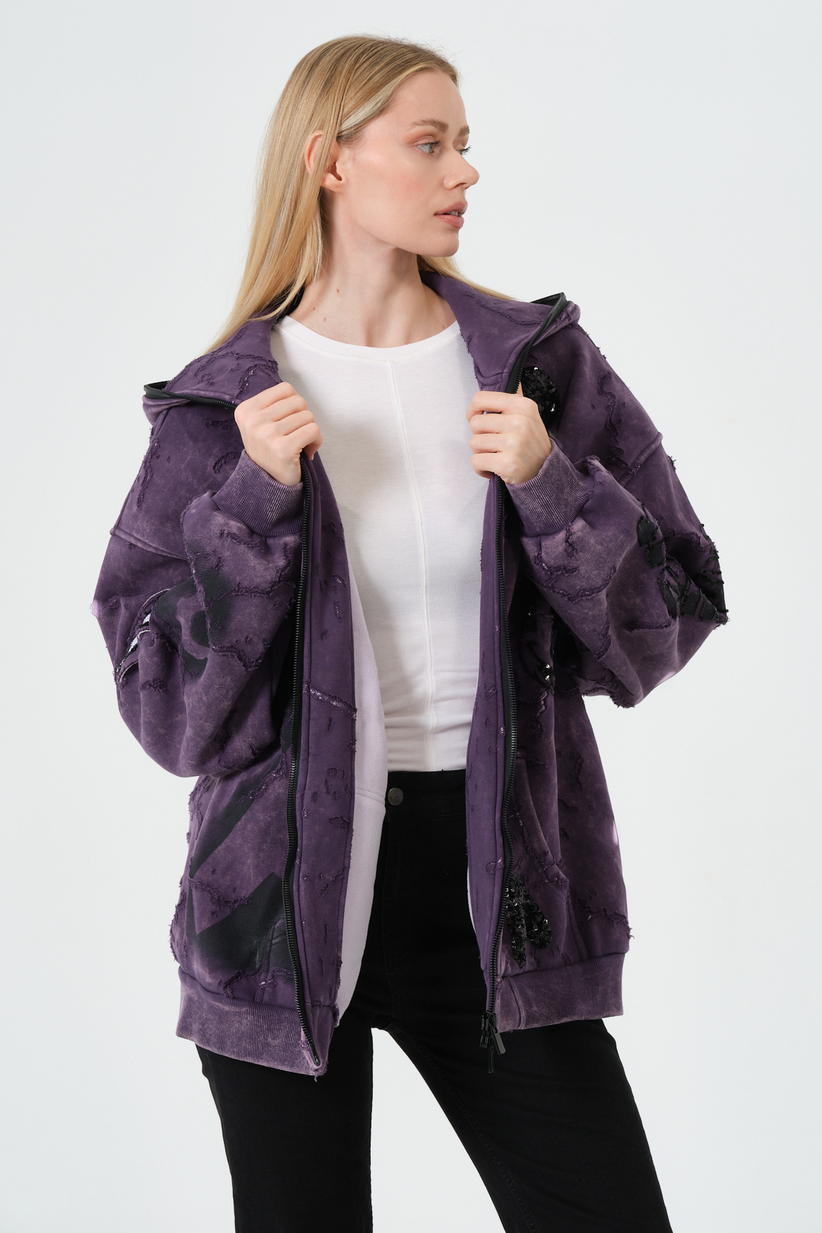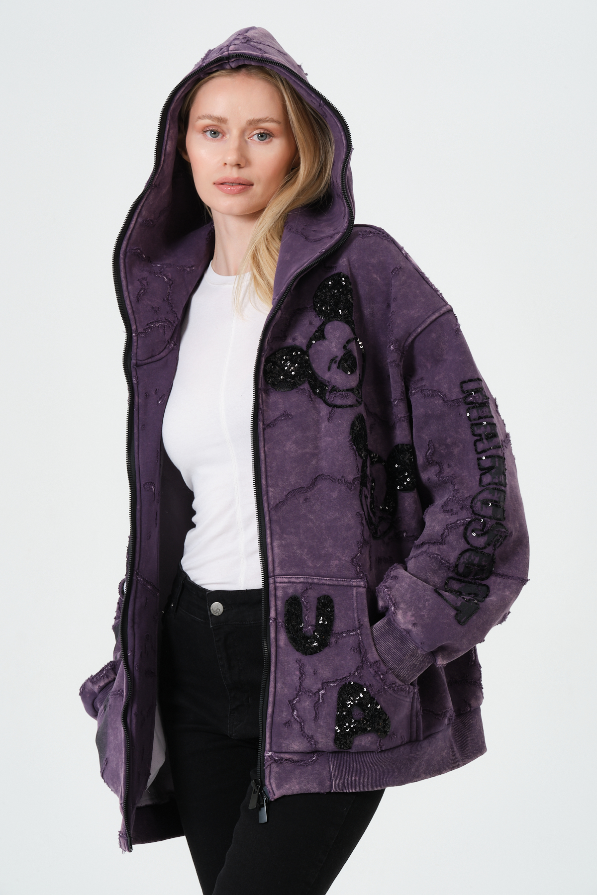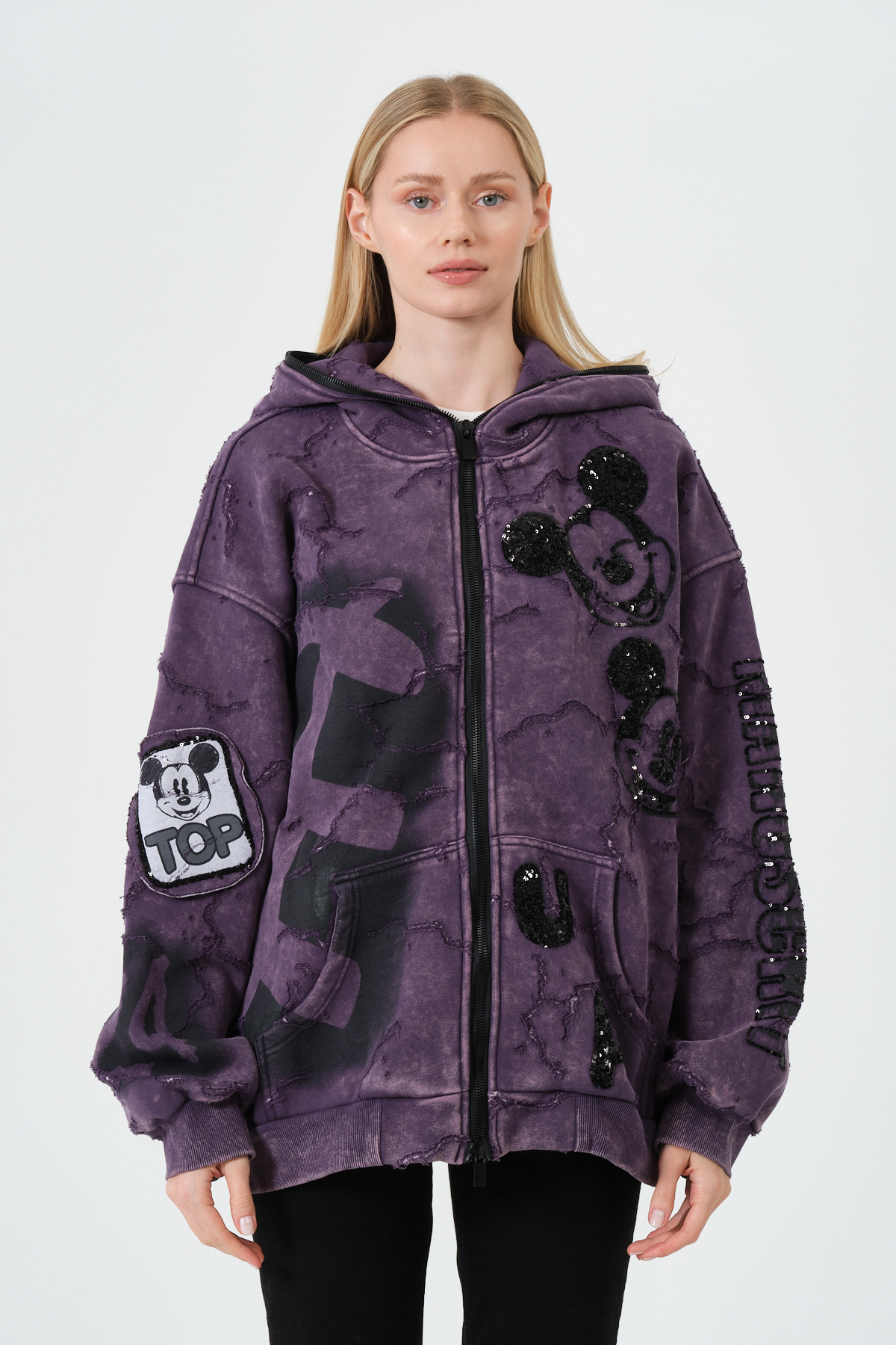 Mor Kadın Oversize Hoodie – Patchwork ve Baskı Detaylı Kapüşonlu Sweatshirt