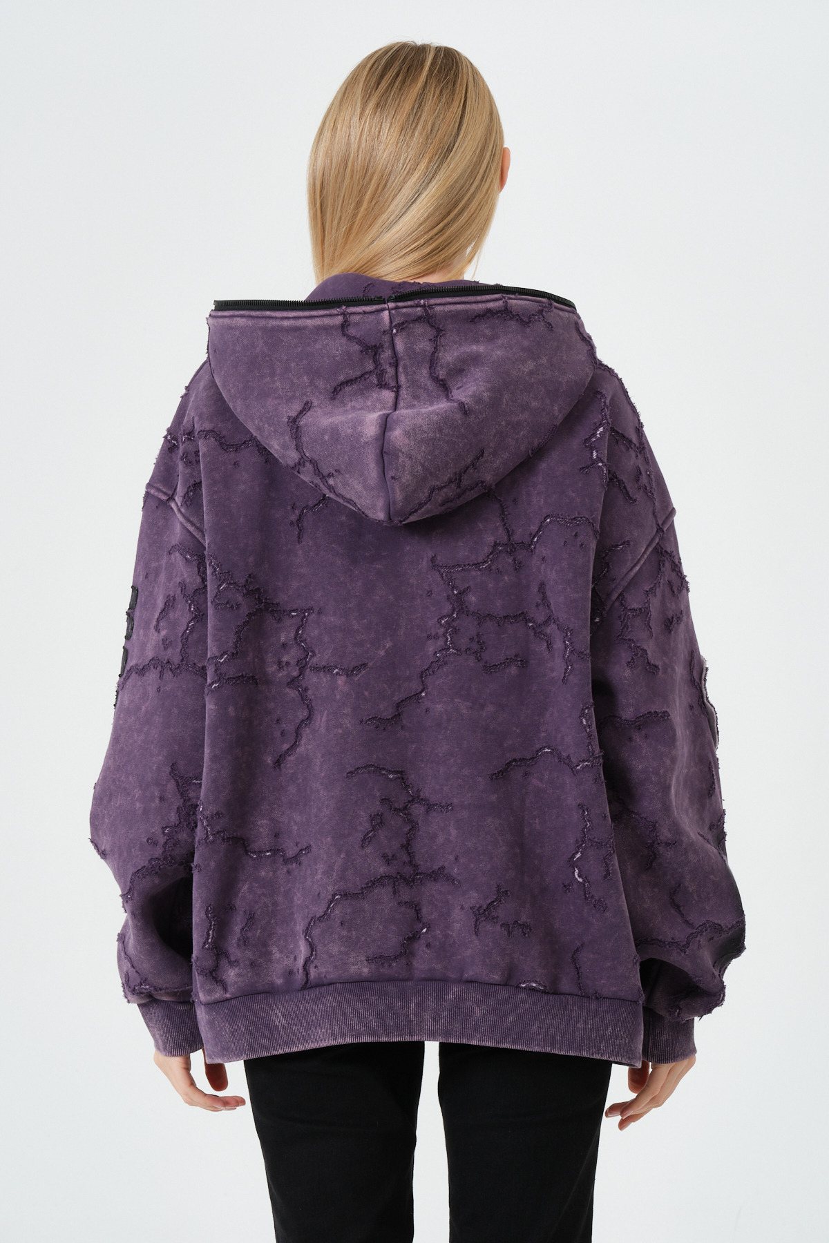 Mor oversize patchwork hoodie; vintage detaylı, rahat kesimli, modern kadın kapüşonlu sweatshirt. Sokak stiline uygun şık ve dikkat çekici tasarım.
