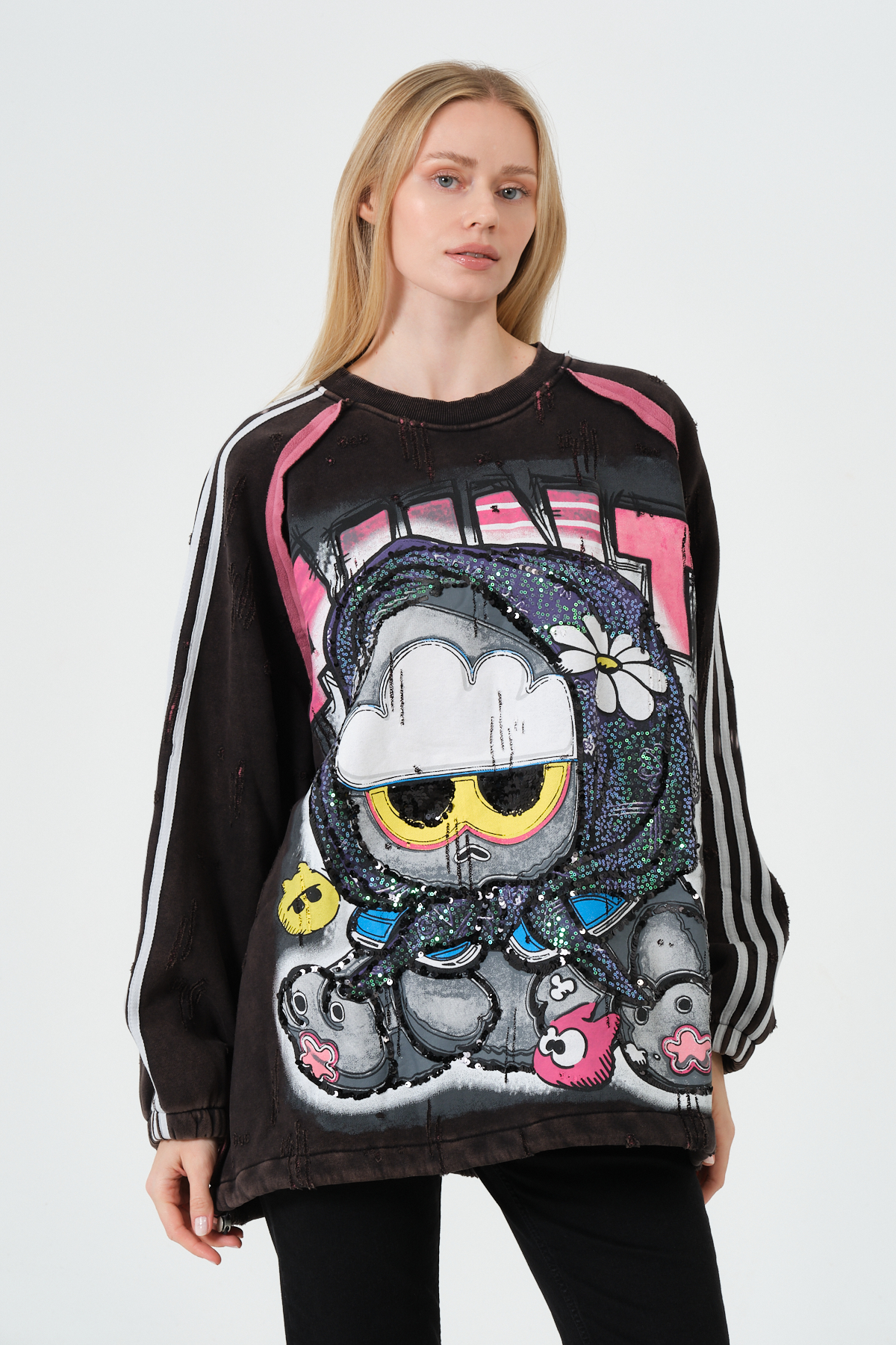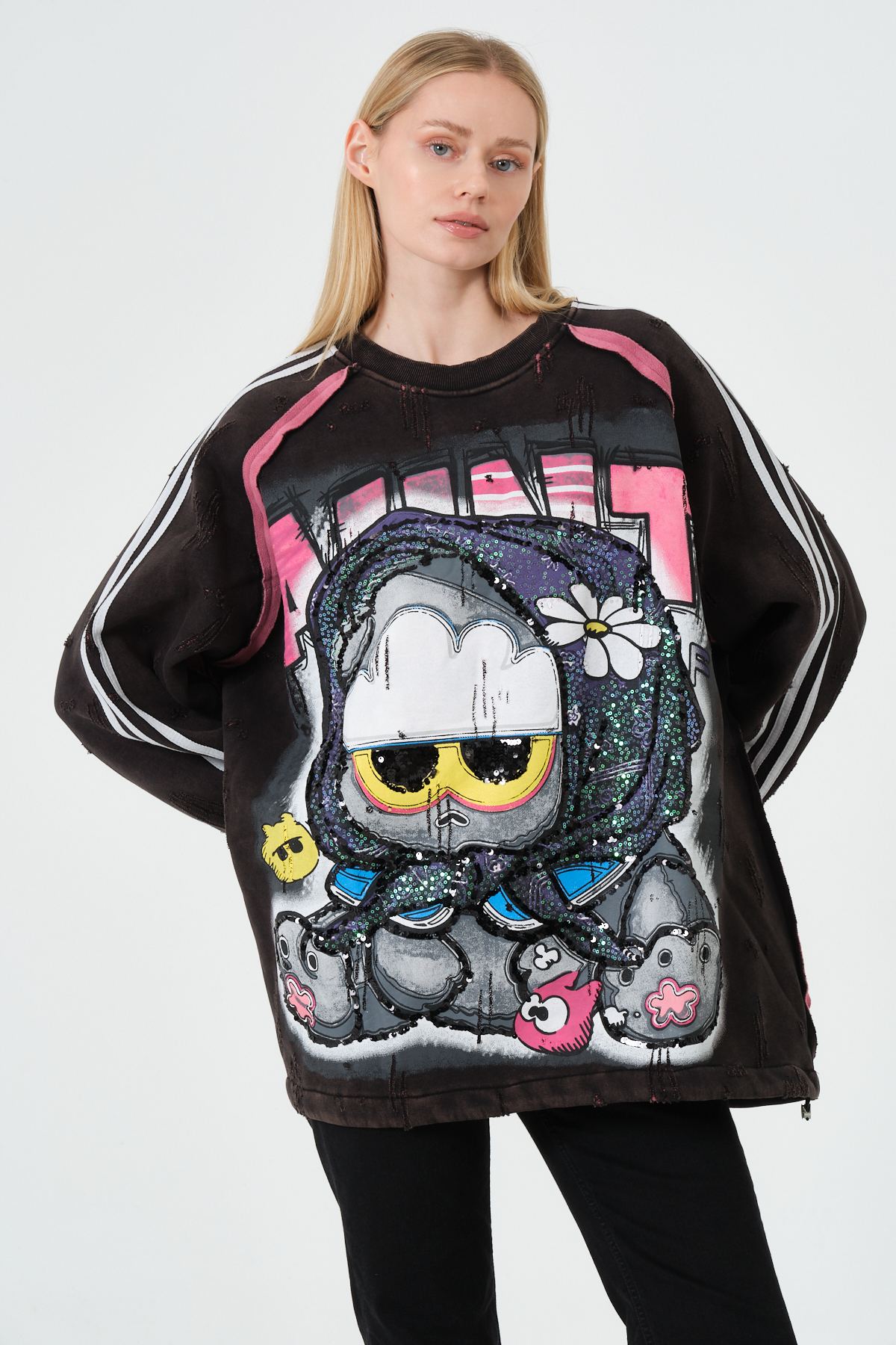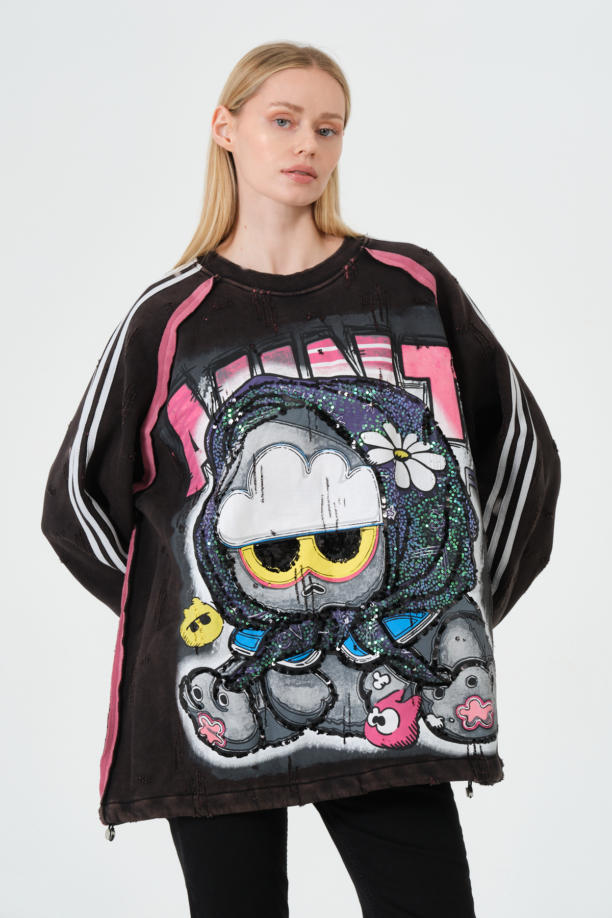 Bu oversize kadın sweatshirt, renkli grafik baskısı, streetwear ruhu ve konforlu kalıbı ile modern sokak modasının en trend parçalarından biri. Yumuşak dokulu kumaşı sayesinde gün boyu rahatlık sunarken, dikkat çekici pop-art karakter detayı tarzınıza enerjik bir dokunuş katar. Rahat oversize kesimi, günlük kombinlerden şehir stiline kadar birçok tarza kolayca uyum sağlar.