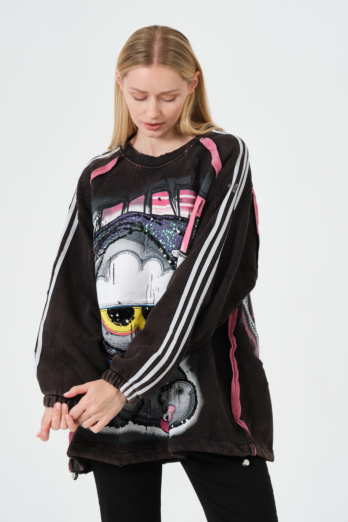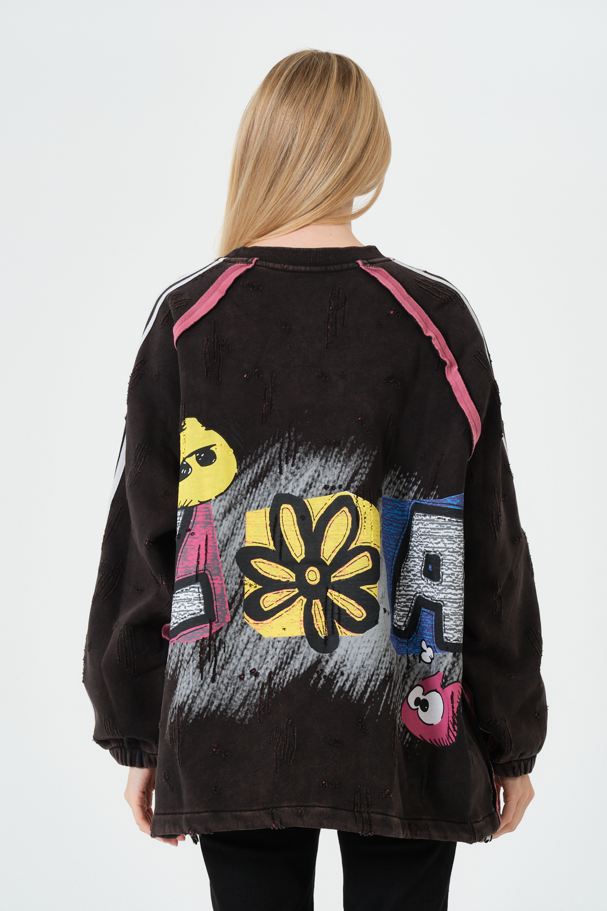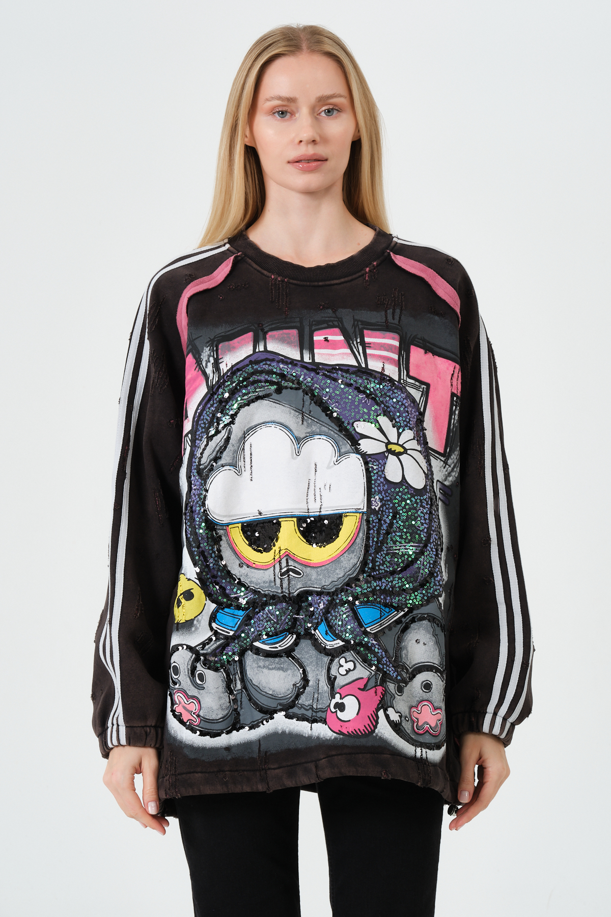 Bu oversize kadın sweatshirt, renkli grafik baskısı, streetwear ruhu ve konforlu kalıbı ile modern sokak modasının en trend parçalarından biri. Yumuşak dokulu kumaşı sayesinde gün boyu rahatlık sunarken, dikkat çekici pop-art karakter detayı tarzınıza enerjik bir dokunuş katar. Rahat oversize kesimi, günlük kombinlerden şehir stiline kadar birçok tarza kolayca uyum sağlar.