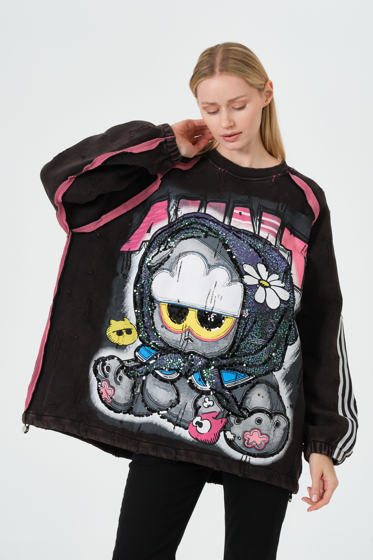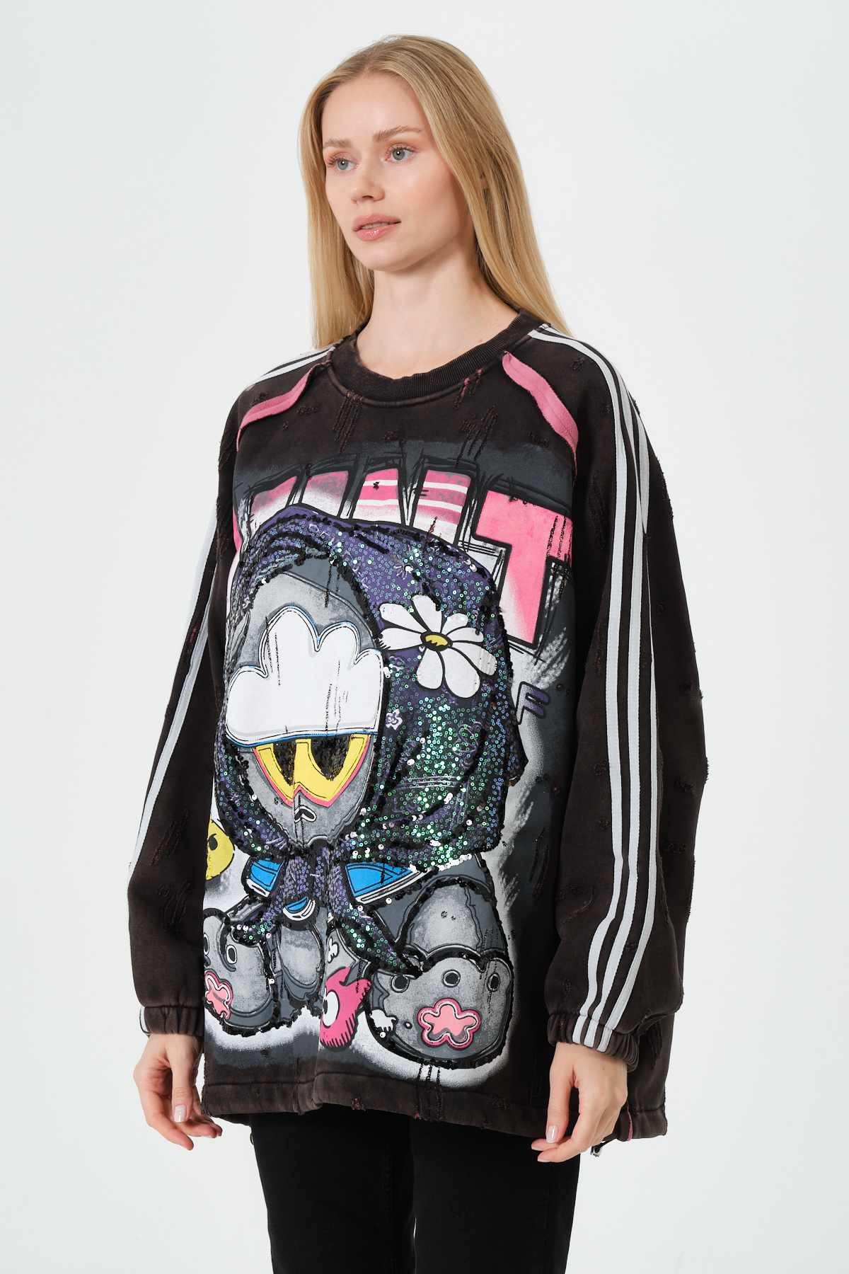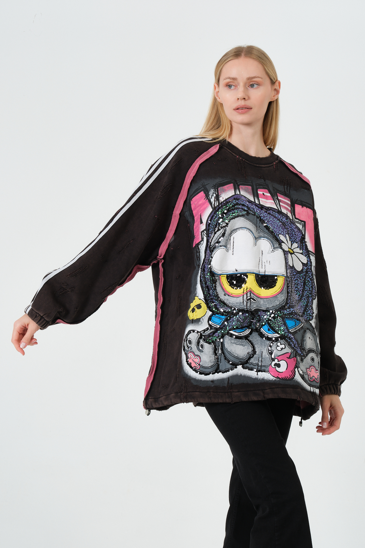 Peluş detaylı, karakter baskılı kadın oversize hoodie. Yumuşak kumaşı ve modern tasarımıyla günlük kullanım için ideal kapüşonlu sweatshirt.